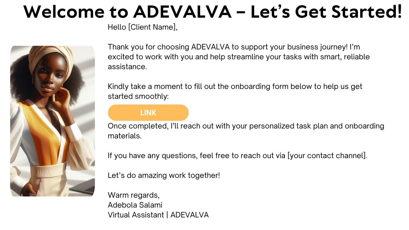 “Adeval Virtual Assistant is a life-saver! They helped me organize my workflows, respond faster to clients, and manage my weekly tasks with excellence. Their creativity, consistency, and professionalism make them an essential part of my business. I highly recommend them to anyone who wants to grow.”